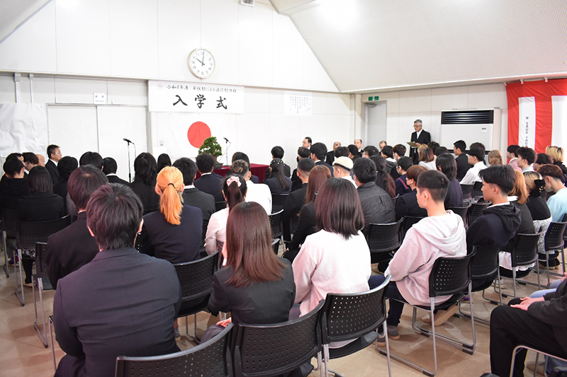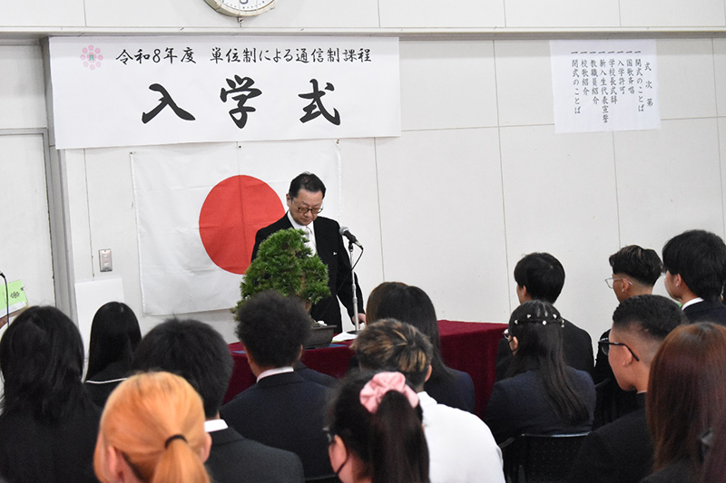 汗ばむような陽気の中、令和8年4月18日(土)に本校の多目的ホールにて単位制による入学式が挙行されました。今年度は、総勢80名(1年相当生52名、2年生相当生16名、3年生相当生12名)の生徒の本校への入学が許可されました。